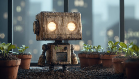 A wooden robot stands beside several small potted plants. The image displays a soft, diffused lighting, highlighting the textures of the wooden robot and the greenery. This conceptual composition could be used to illustrate themes related to technology, artificial intelligence, environmental responsibility, and innovation in a commercial setting.