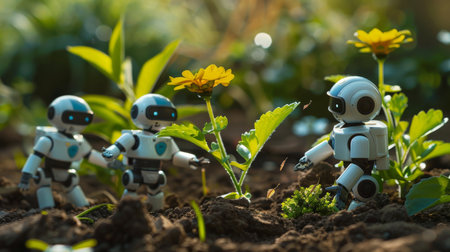 Tiny robots engage in a learning session about a blooming yellow flower in an earthy garden environment.