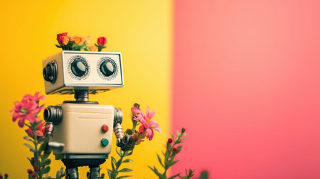 A cute retro robot with flowers on its head stands among vibrant pink and yellow flowers, set against colorful yellow and pink background