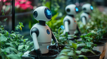 Small agricultural robots tending to plants in a futuristic greenhouse