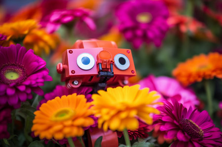 Small cute robot among colorful magenta orange flowers, looking romantic. Generative AI