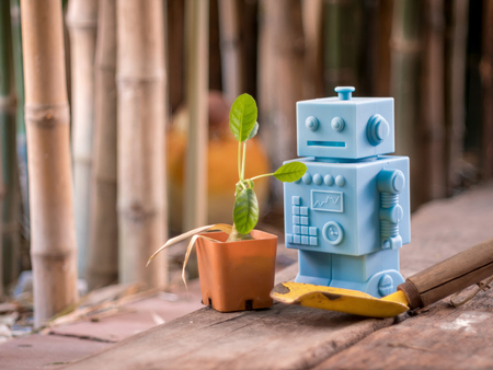 Miniature robot with seedlings in the garden. Concept of artificial intelligence.