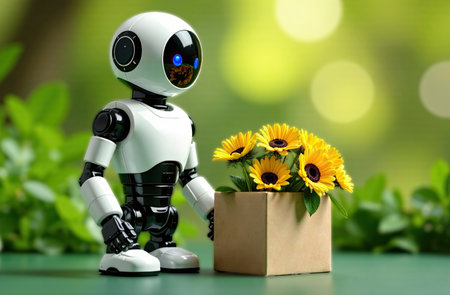 A robot is holding a box of flowers. The scene is peaceful and serene, with the robot and flowers creating a sense of harmony and balance