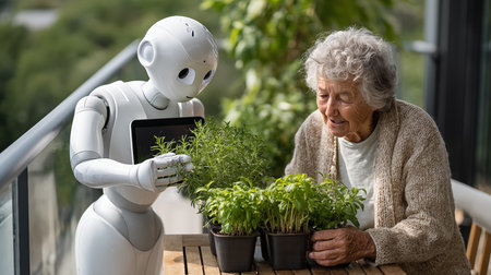 Elderly woman and robot working together on a terrace.
