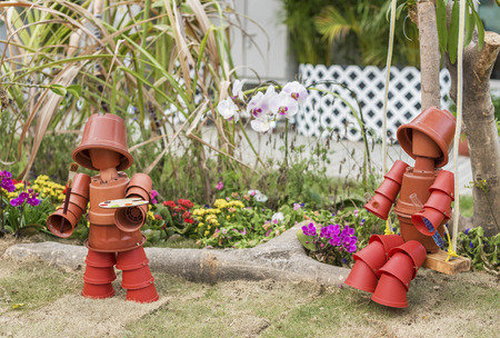 Close​ up​ of toy doll​ made of flower pot in backyard garden