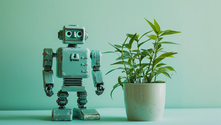 A charming robot stands among green plants, symbolizing innovation and nature