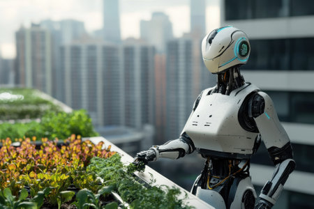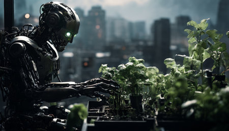 Humanoid robot tending to plants in a futuristic cityscape