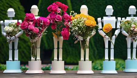 Multiple white robots with floral arrangements in their arms, standing in a lush garden setting.. AI Generation