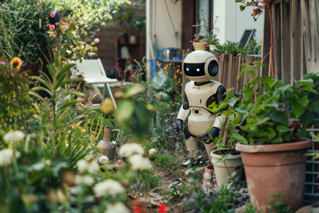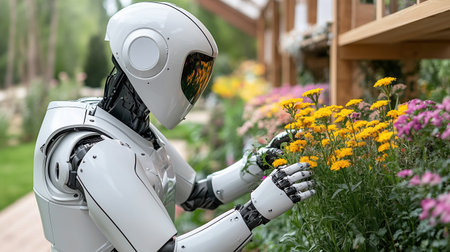 An autonomous robot participates in garden maintenance, delicately handling plants and flowers, showcasing robotic assistance in home gardening