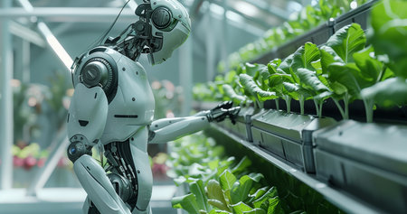 A humanoid robot working in an indoor farm, tending to plants and growing vegetables, showcasing the integration of AI technology into agriculture