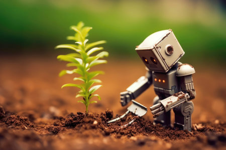 Artificial intelligence humanoid robot planting seeds, symbolizing the growth and evolution of robotic technologies, blurred sunny background. Generative ai.