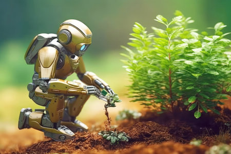 A robot gently waters a small tree in a calm setting, representing the harmony between nature and innovation.