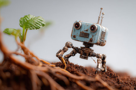 Amidst dark soil, a small robot with a vintage design examines a young green plant, embodying adventure and curiosity.