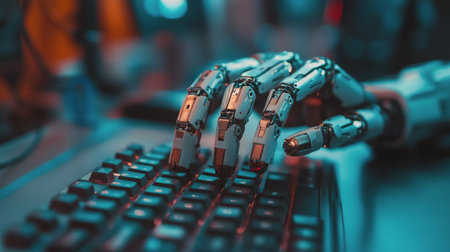 A robotic hand is seen actively typing on a computer keyboard in a futuristic workspace. The atmospheric lighting enhances the advanced technology surrounding it.