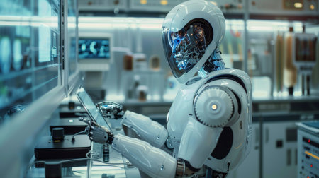 Modern humanoid robot standing amidst advanced scientific equipment in a futuristic laboratory setting