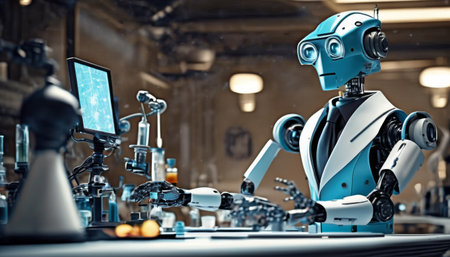A sophisticated blue robot working at a high-tech laboratory desk, surrounded by digital screens and advanced equipment.. AI Generation