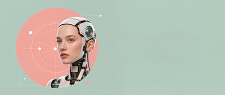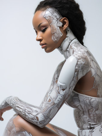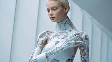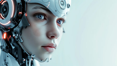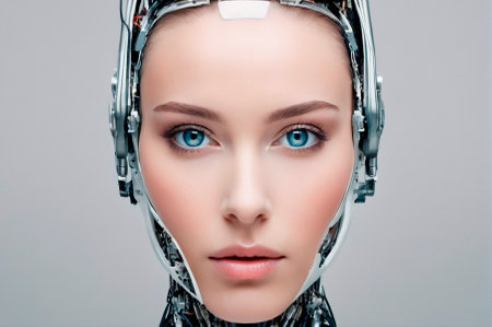 Close up portrait of a beautiful young woman with futuristic robot body.