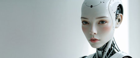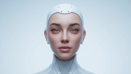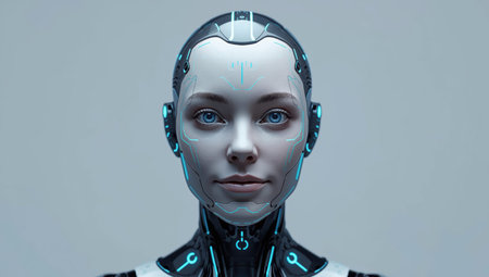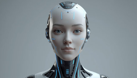 Futuristic humanoid robot portrait with soft expression and blue LED accents