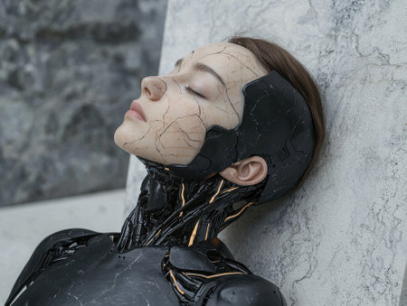 Cyborg woman with cracked face and exposed robotic parts lying down
