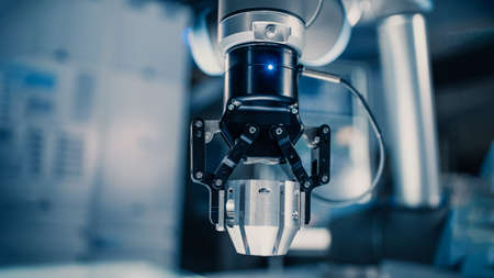 Futuristic Artificial Intelligence Robotic Arm Operates and Moves a Metal Object, Picks It Up or Puts it Down under Technician Control. High Tech Research Laboratory with Modern Equipment.