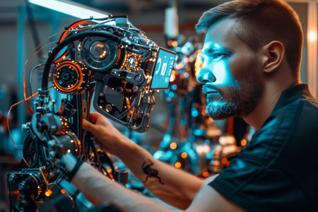 Close-up of robotic technician coding in advanced AI lab, detailed automation setup ideal for branding