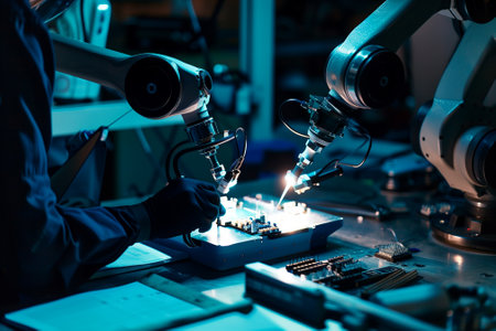 Robotic arms are showcased in a contemporary manufacturing facility, expertly assembling circuit boards and electronic components with precision and efficiency.