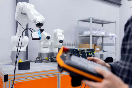 Closeup engineer using industry robot setup operate control by remote control in modern plant factory