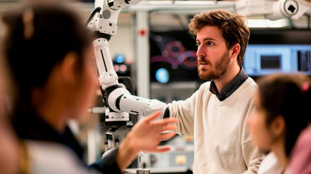 In a high-tech lab, a male scientist engages with a robot, highlighting the innovative strides in mechanical and artificial intelligence engineering.