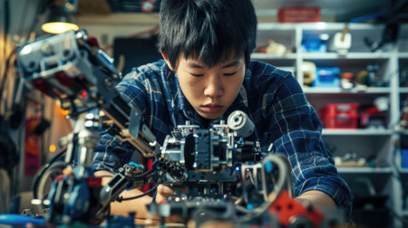 The picture of the east asian male teenager is working on the mechanical robot in his own workshop, the technician also require skill like technical knowledge, time management and experience. AIG43.