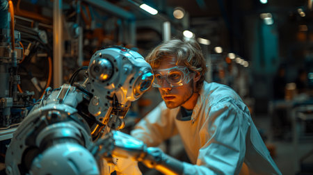 Robotics engineer carefully examining and testing prototype of humanoid robot in modern laboratory