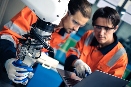 Multiracial tachnicial engineer training with robot arm machine in Robot machine factory workshop.