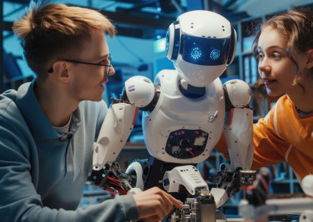 Students in a robotics workshop programming AI robots to perform tasks, fostering skills in automation and mechanics