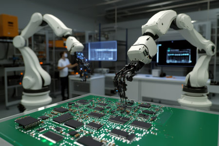 robot manipulating advanced electronic components in a high-tech workshop, with a futuristic technology theme and space for text