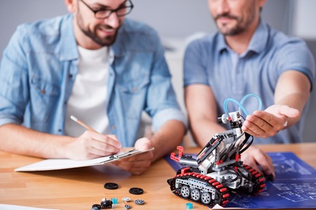 Work with pleasure. Check it out. Cheerful delighted professional colleagues sitting at the table and working in the office while testing robot