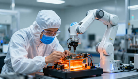 Engineer wearing protective suit and mask operates a robotic arm to assemble circuit boards in a high-tech laboratory. Advanced technology and precision manufacturing.
