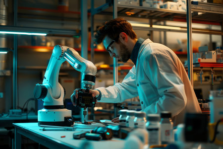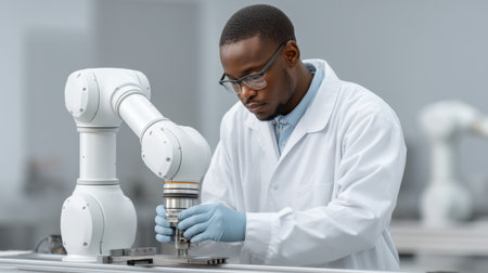 A researcher is focused on fine tuning robotics equipment in a modern laboratory. Wearing protective gear, he skillfully adjusts machinery to ensure optimal performance.