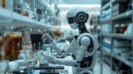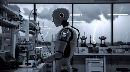 Modern humanoid robot standing amidst advanced scientific equipment in a futuristic laboratory setting