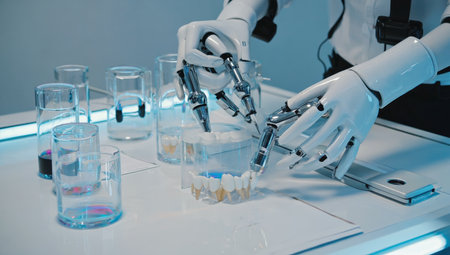 Advanced robotic arms working with dental prosthetics in modern laboratory, surrounded by glassware and tools, symbolizing innovation in dentistry, robotics, artificial intelligence, healthcare tech.