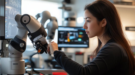 Woman working with robotic arm in modern technology lab focused on artificial intelligence