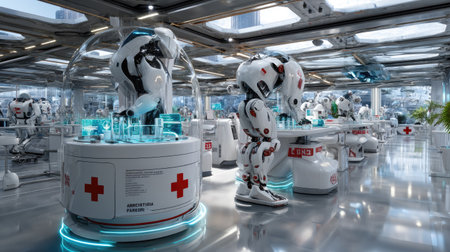A captivating scene showcasing advanced robots in a high-tech medical facility, emphasizing innovation and the future of healthcare services and patient support.