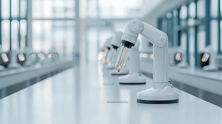 This image showcases a modern laboratory equipped with robotic arms and glass tubes, emphasizing automation and advanced technology in scientific research. Ideal for illustrating innovation and precision in a clean workspace.