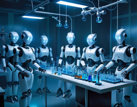 A group of sleek white humanoid robots handling colorful liquid substances in a high-tech science laboratory setting.. AI Generation