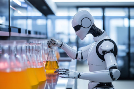 Humanoid robot carefully handling glassware containing yellow liquid, conducting scientific experiment in modern laboratory setting