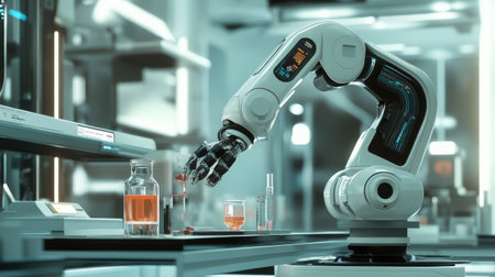 Advanced robotic technology in a futuristic lab highlights automated systems and innovative research processes, showing the future of science and technology