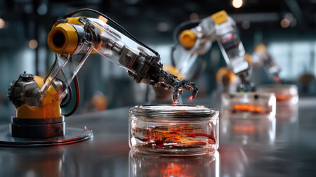 This striking image captures robotic arms delicately interacting with a transparent jar in a modern industrial environment, showcasing the synergy between technology and precision tasks.