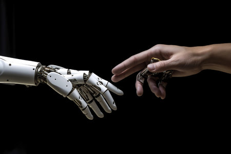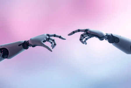 Precision-engineered robotic fingers gently intertwine, creating a symbolic symbol of harmony between technology and human emotion.