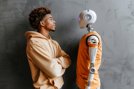 A young man observes a humanoid robot closely, exploring the connection between human and machine in a workshop.