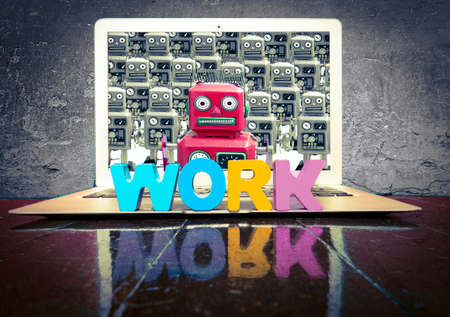 the word PROGRAMMING with wooden letters and retro toy robots on an old wooden floor with reflection