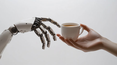 A robot hand reaching to offer a cup of coffee to a human hand in a minimalist setting