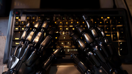 Conceptual image of artificial intelligence (AI). Robotic hand pointing to keypad with red texts of a black notebook. Earphone partly visible. Selective focus on keypad with red texts.